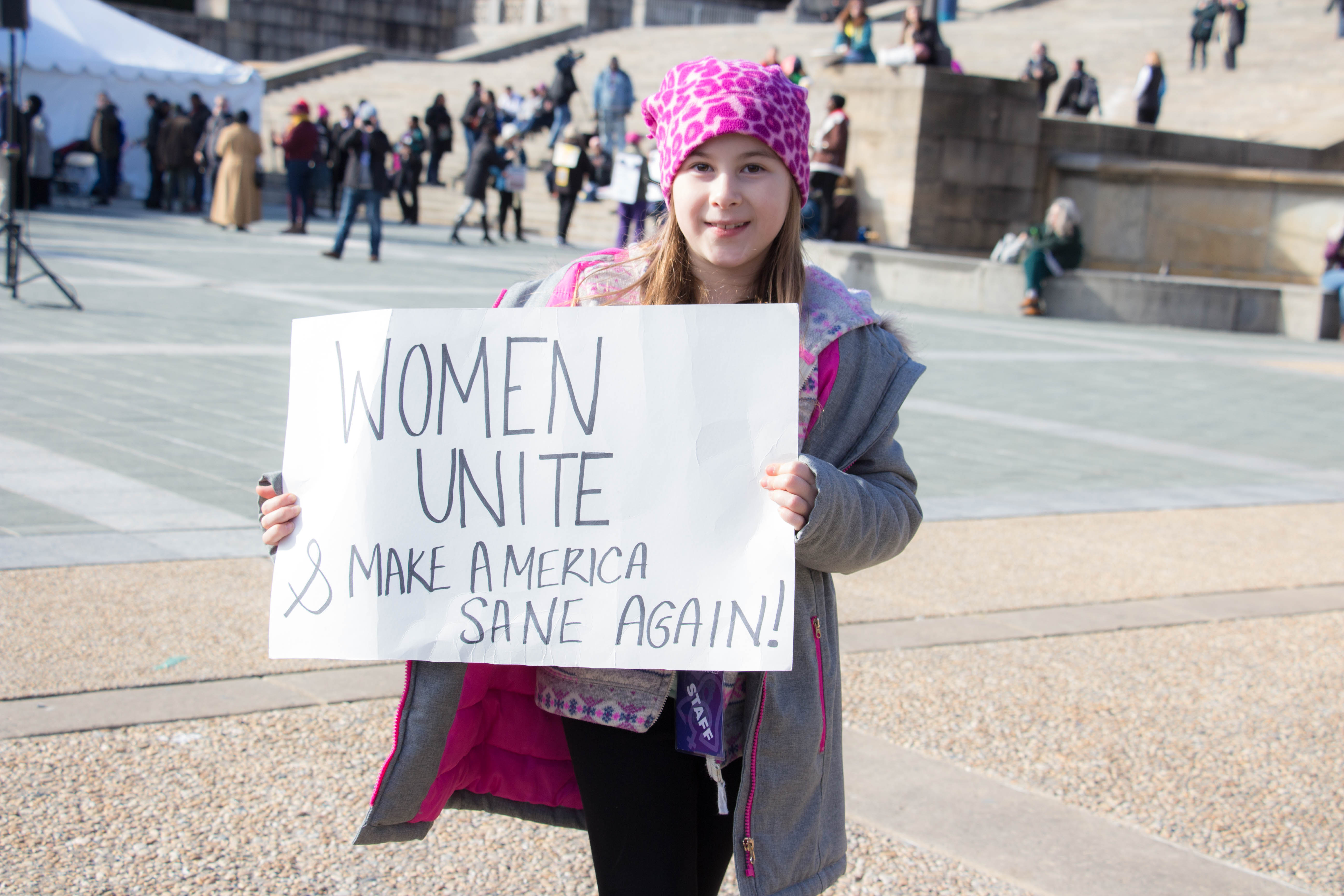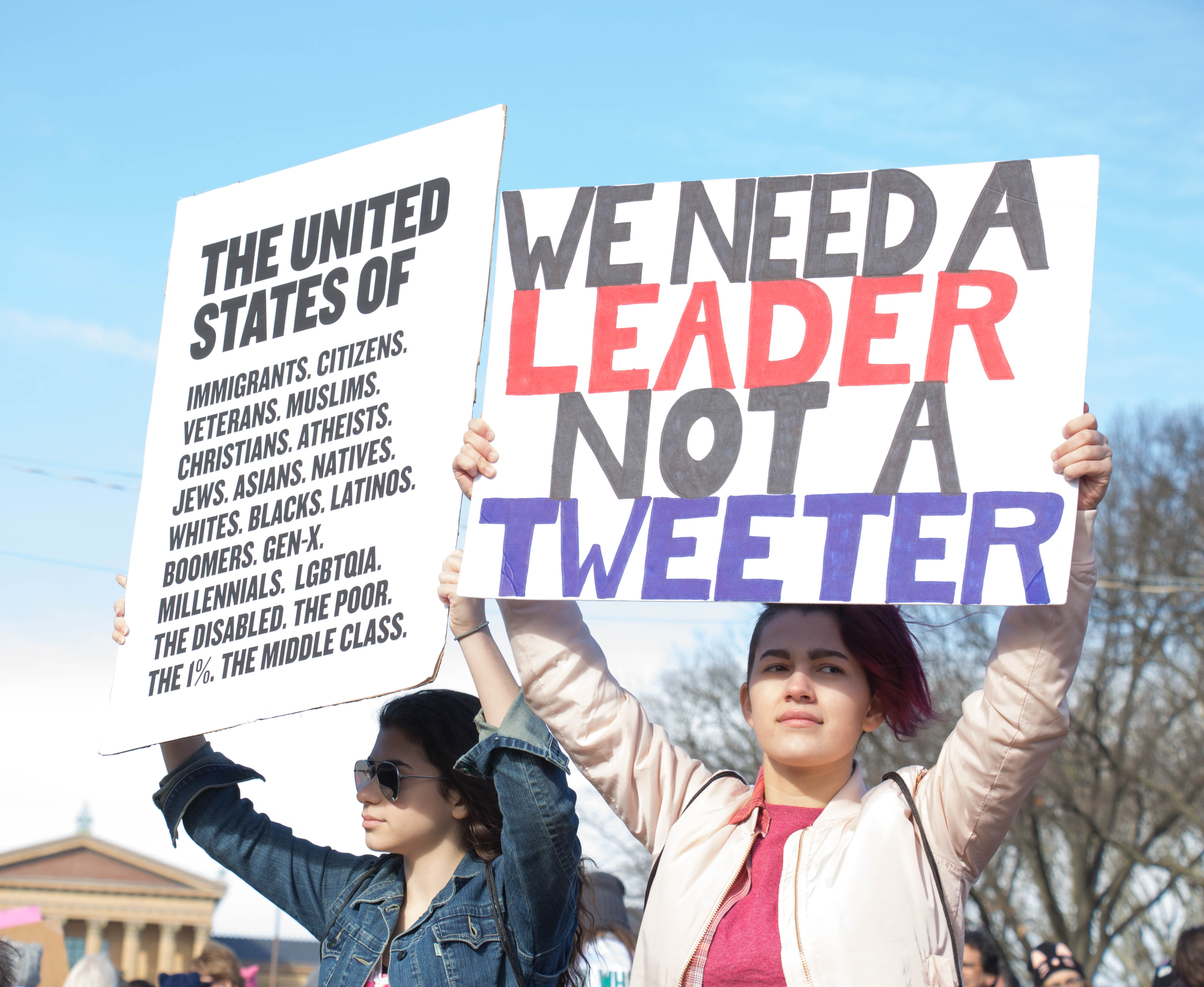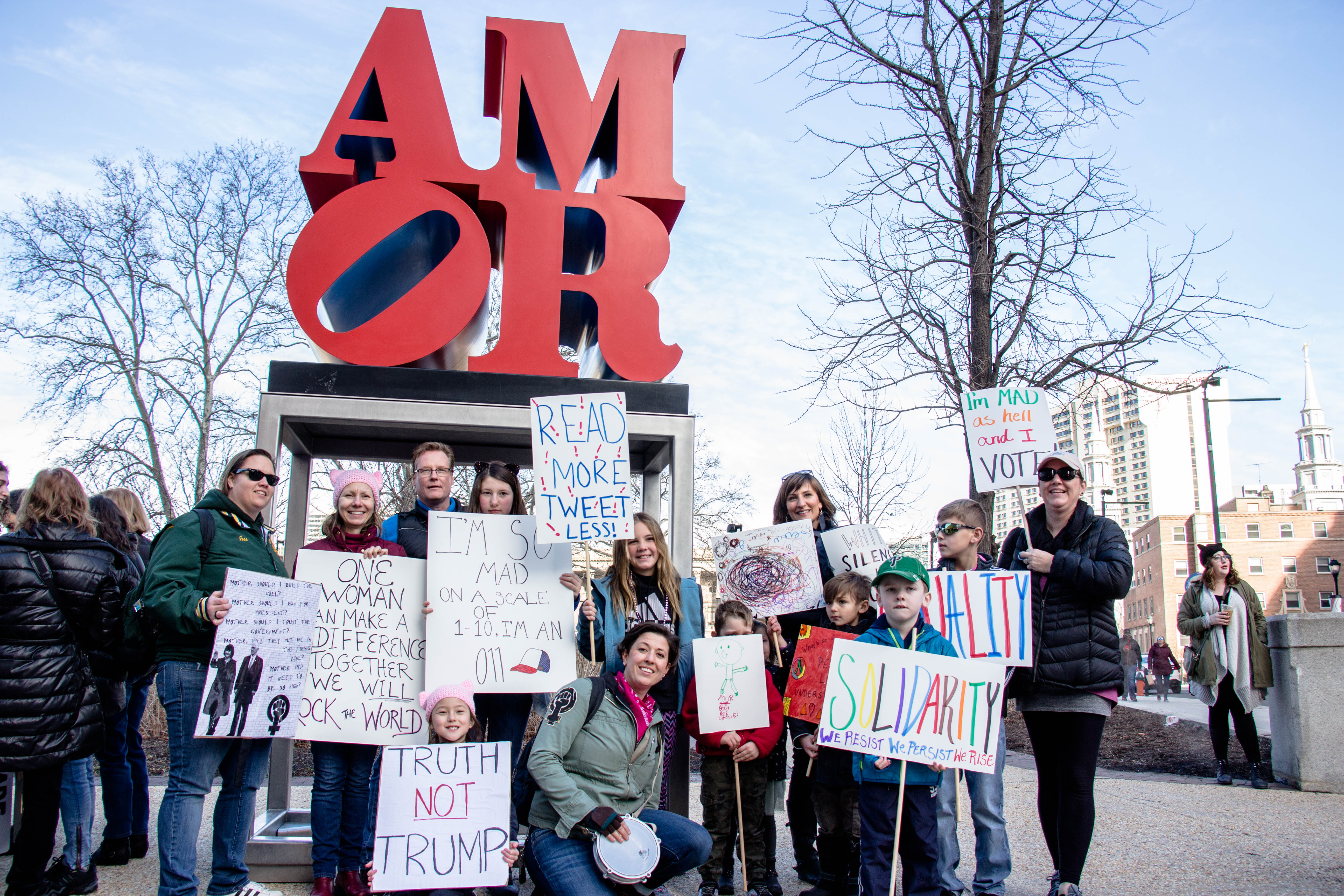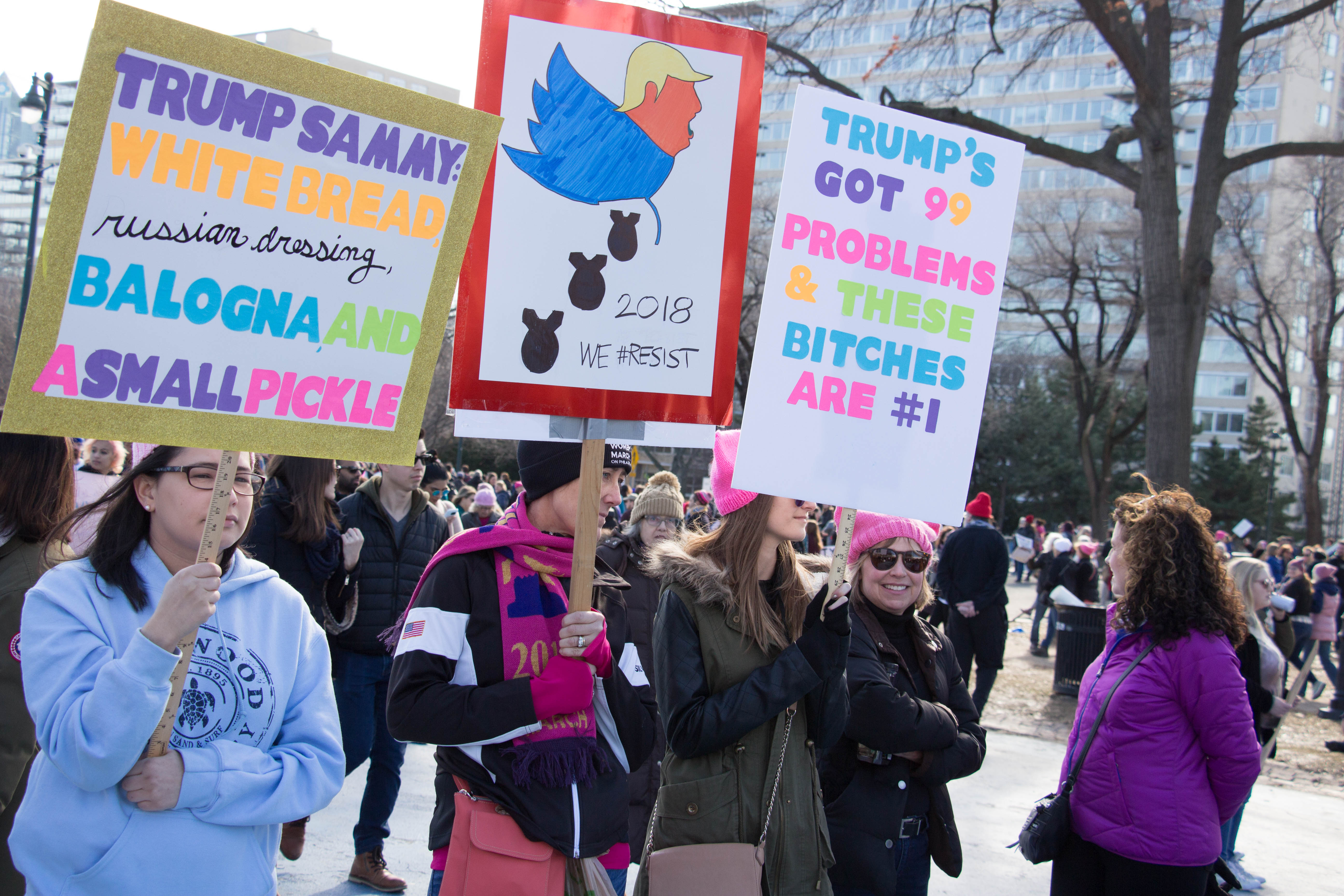 Arriving at Benjamin Franklin Parkway was a 10,000-citizen march and protest near Logan Square and the Philadelphia Art Museum. Signs were held up with mocking images of Trump, some Republican party members who support Trump and who are to blame, rainbow-colored flags, people dressing up in costumes, and thousands of propaganda signs of women’s rights and feminism.