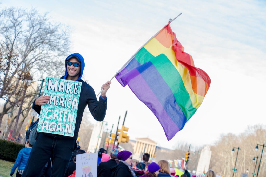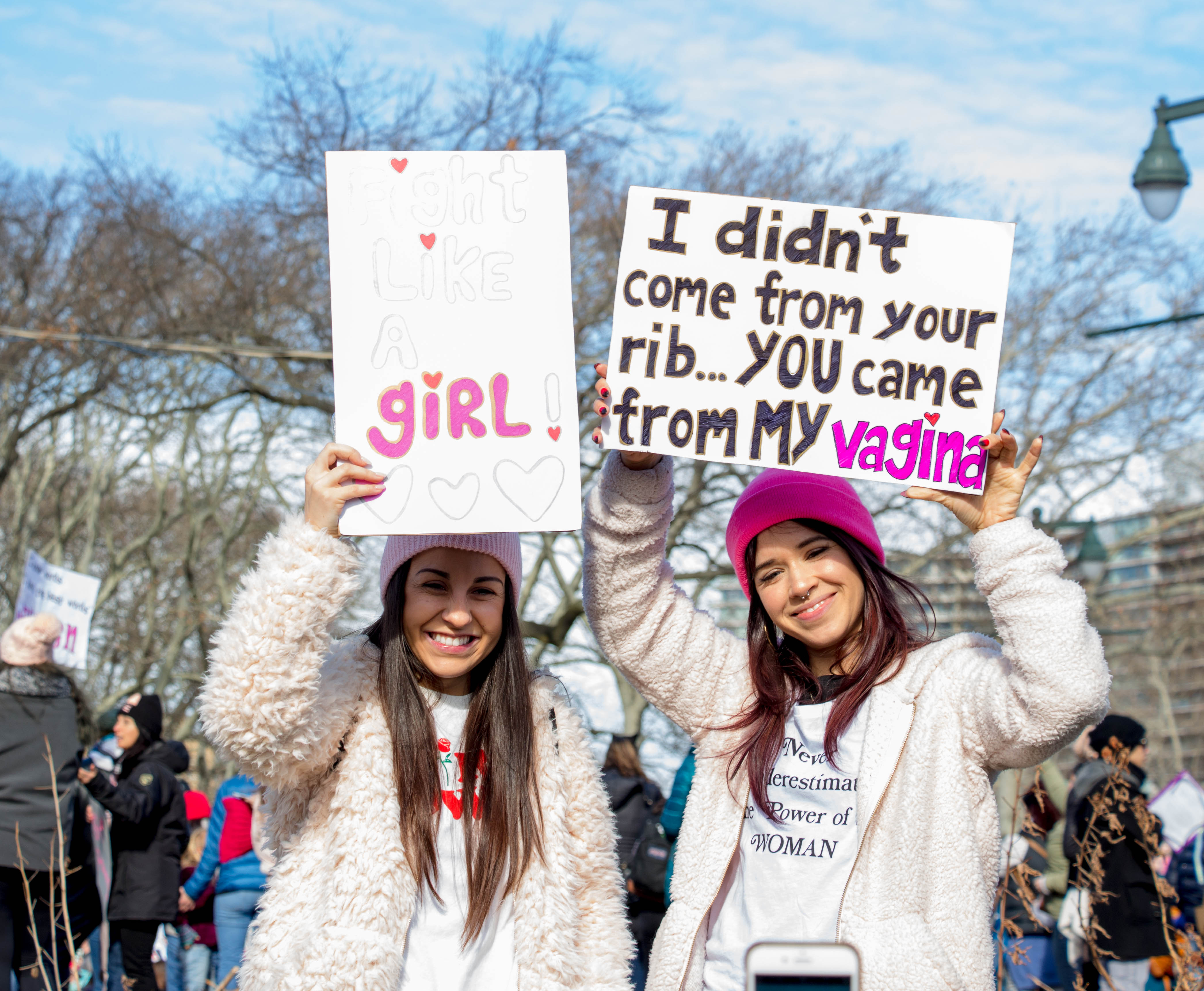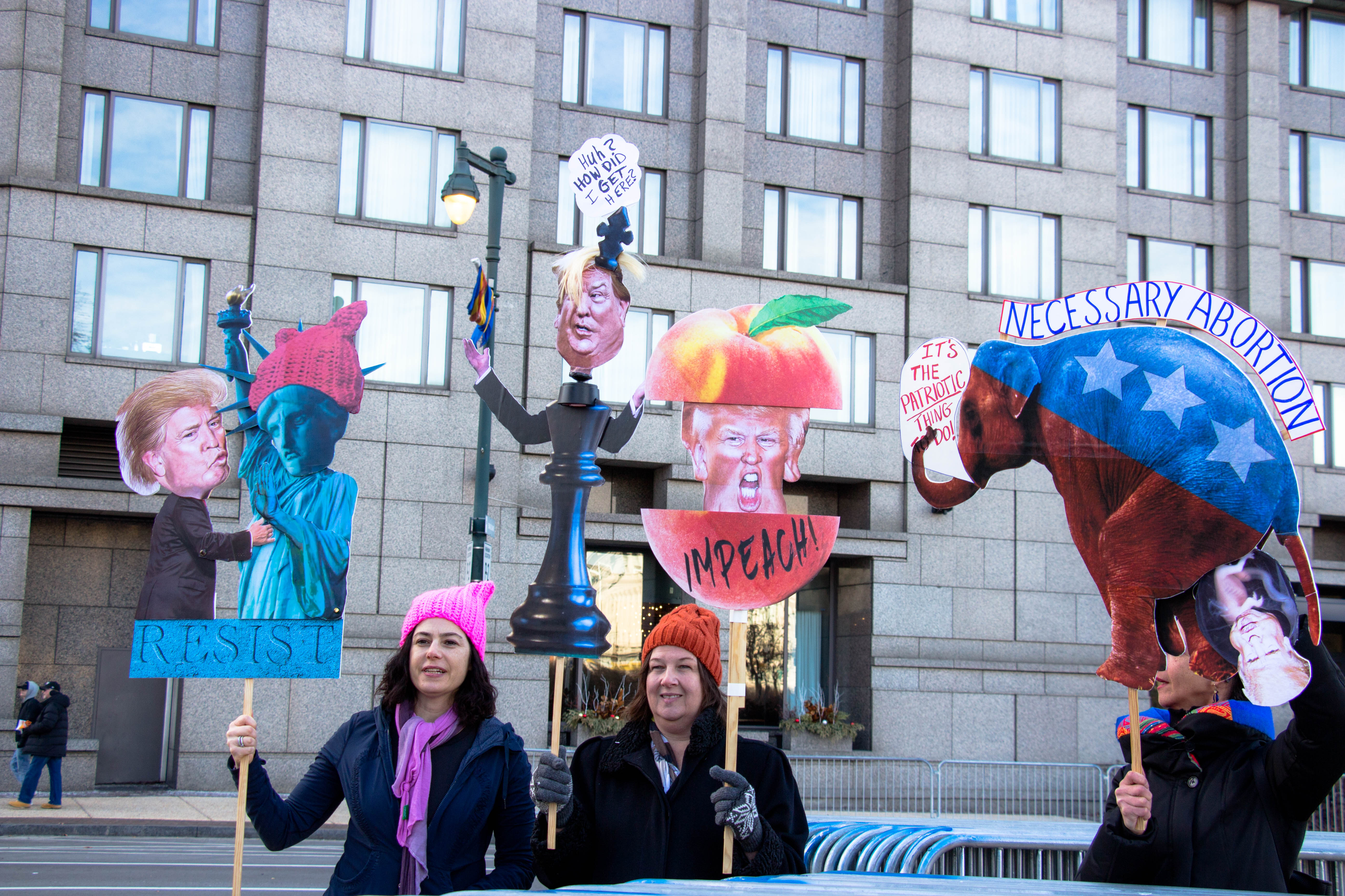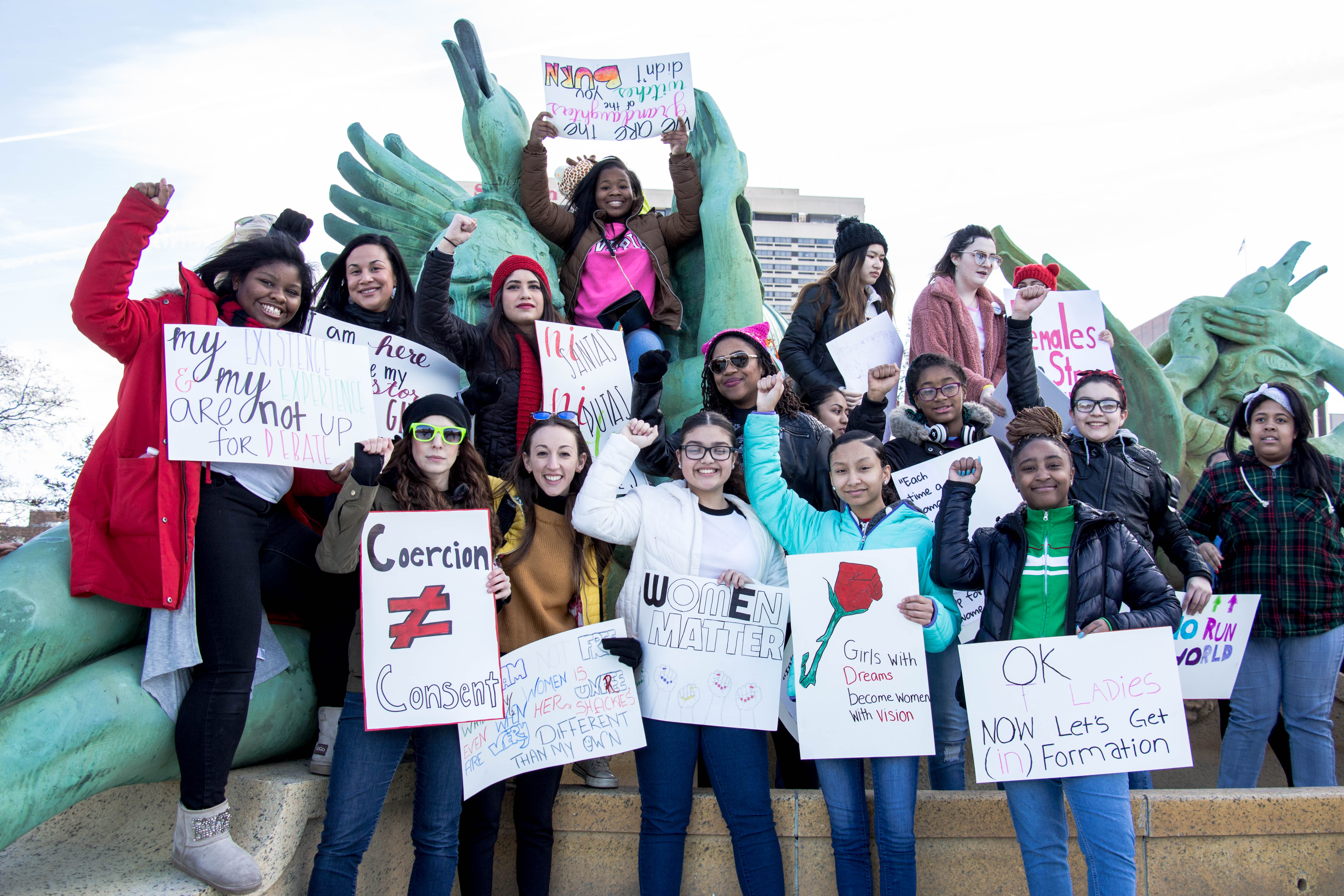 Arriving at Benjamin Franklin Parkway was a 10,000-citizen march and protest near Logan Square and the Philadelphia Art Museum. Signs were held up with mocking images of Trump, some Republican party members who support Trump and who are to blame, rainbow-colored flags, people dressing up in costumes, and thousands of propaganda signs of women’s rights and feminism.